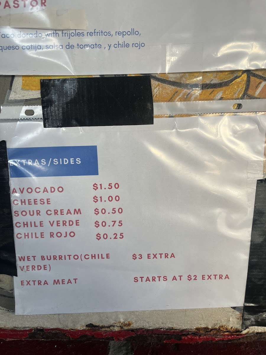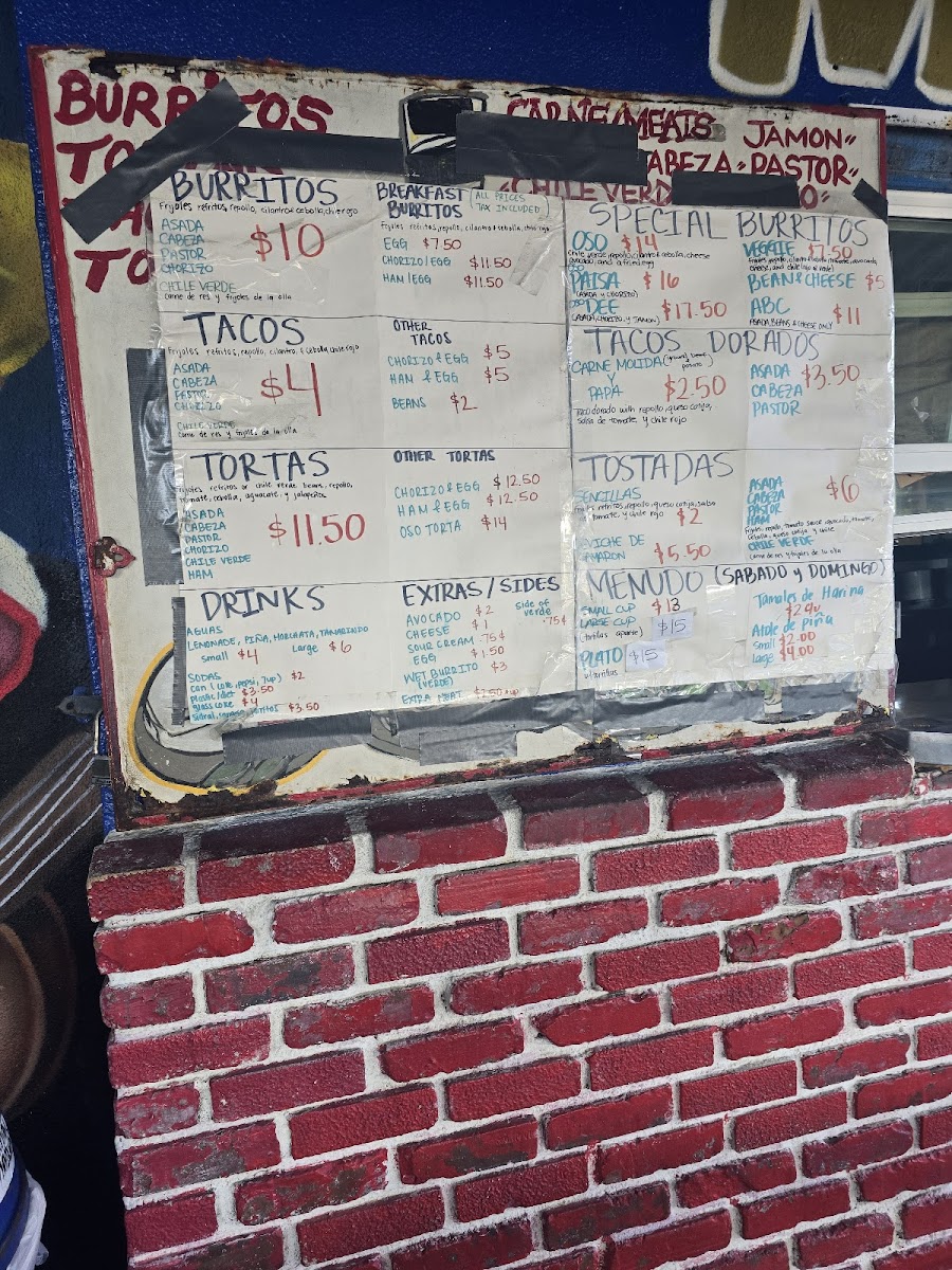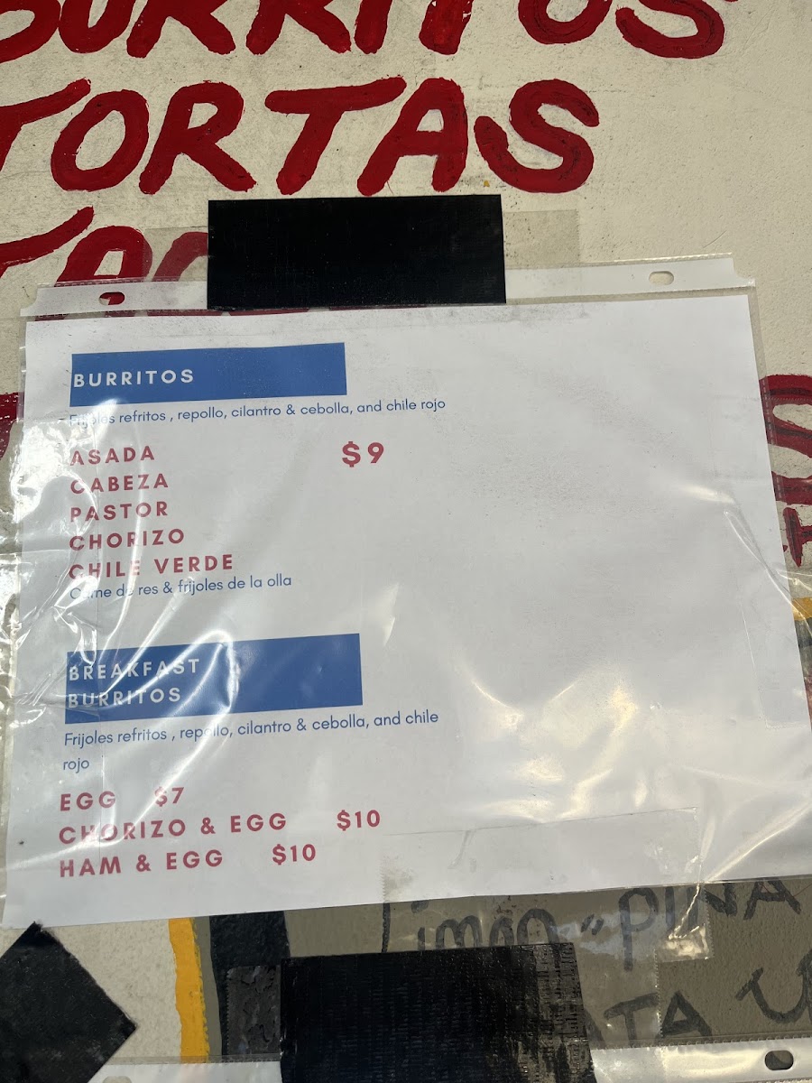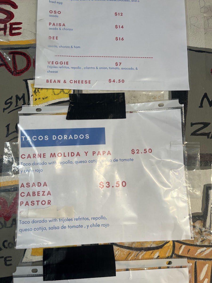 The menu accommodates quick orders as well as casual dining occasions, with a focus on fillings such as rice, beans, cheese, and eggs, which provide balanced flavors and textures. The offerings are suitable for hearty breakfasts or filling lunch and dinner meals.
