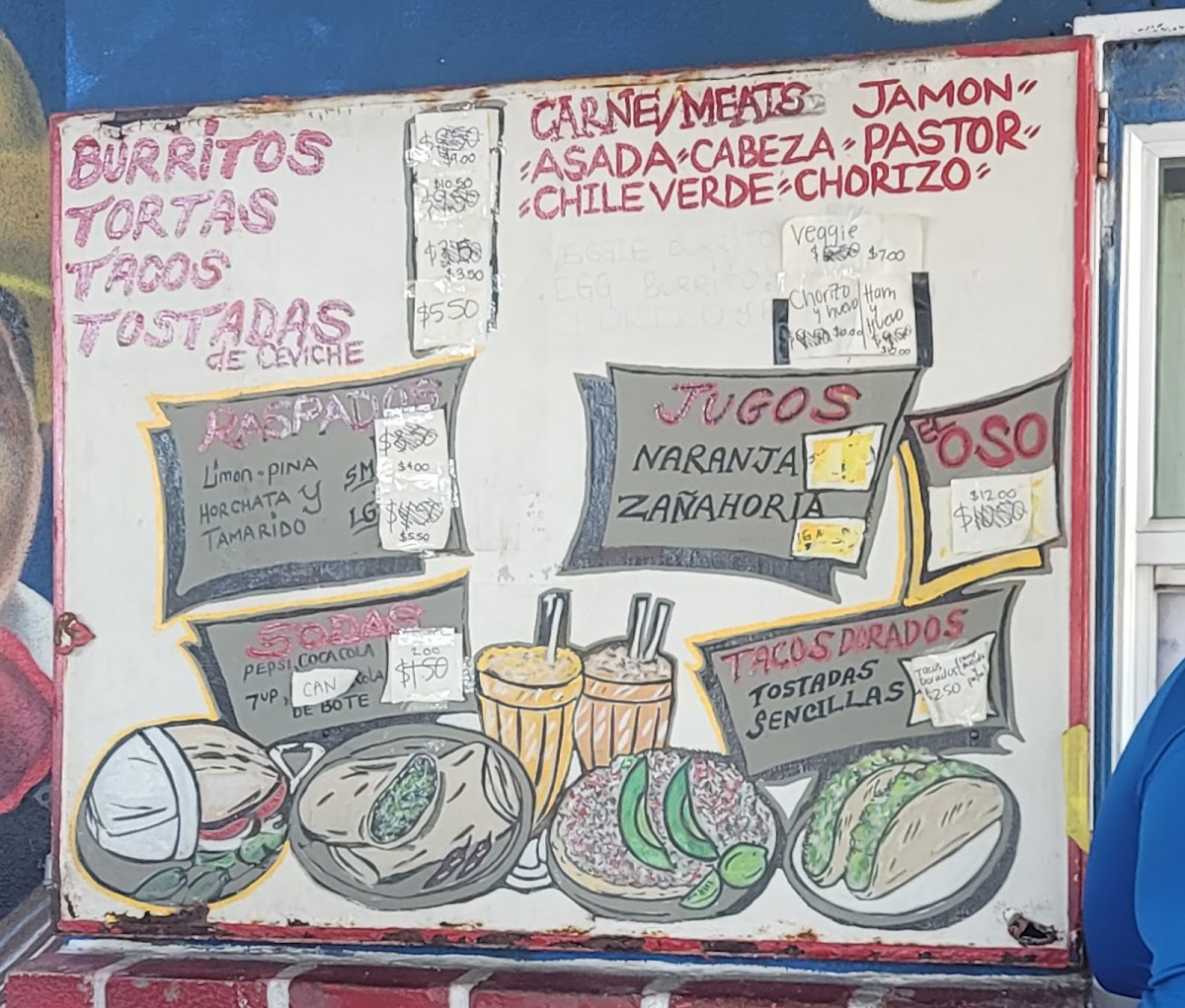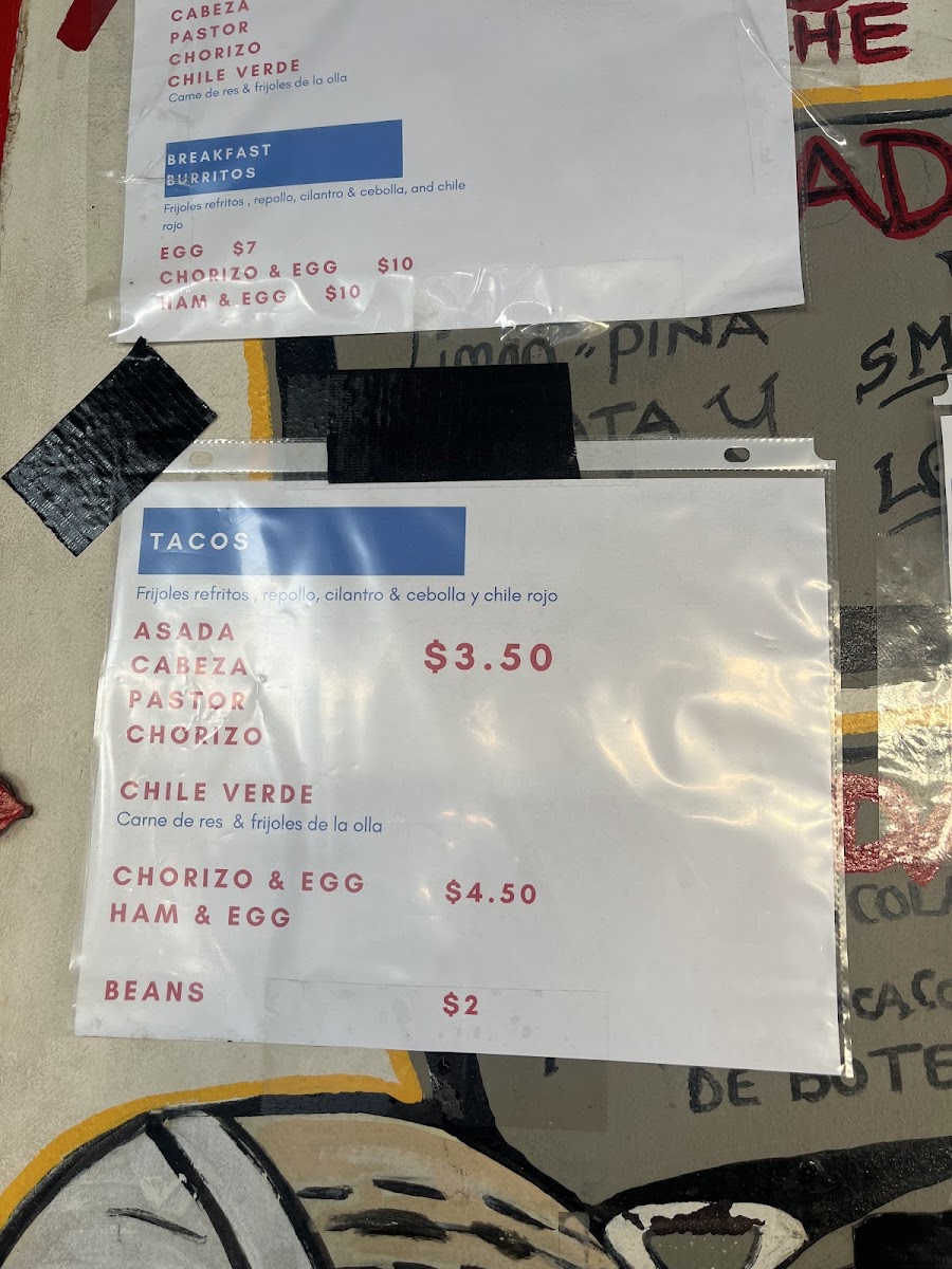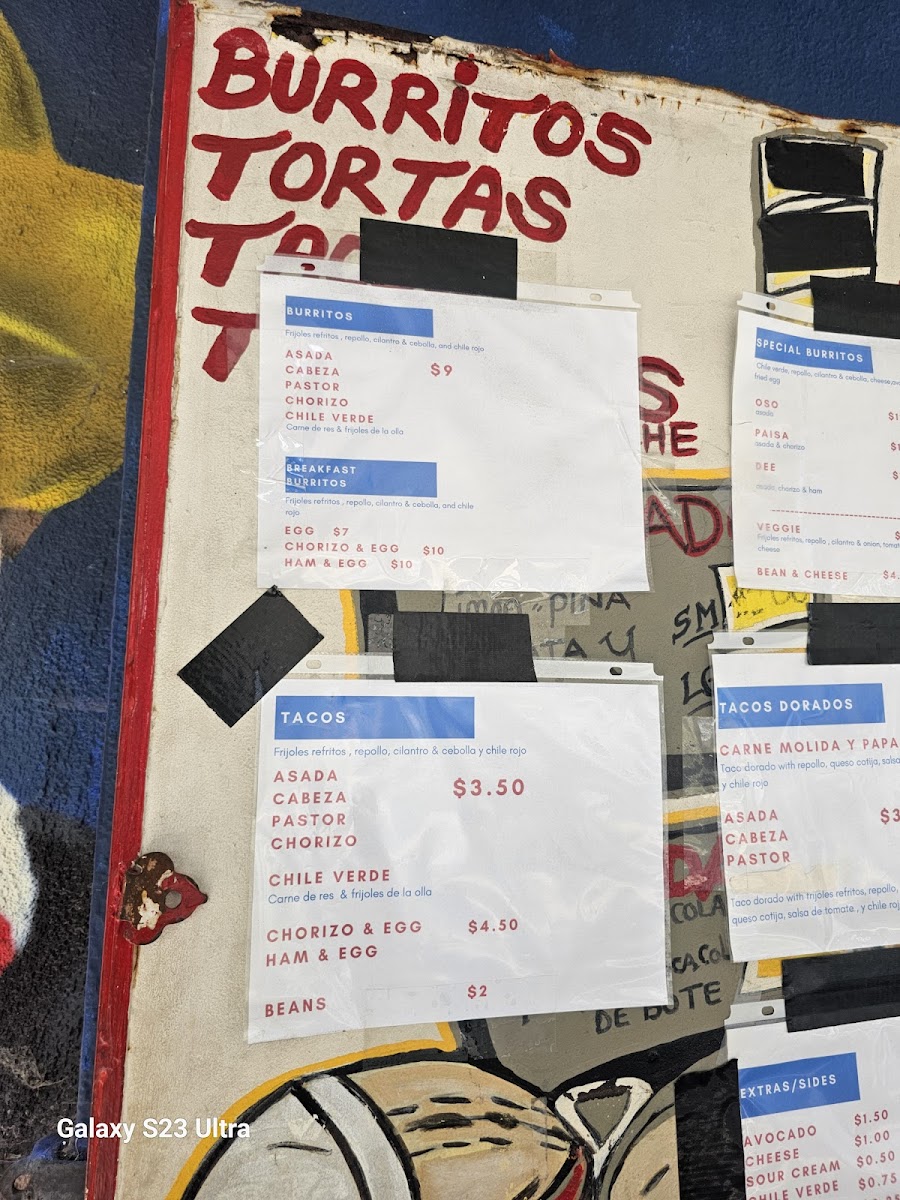 The menu accommodates quick orders as well as casual dining occasions, with a focus on fillings such as rice, beans, cheese, and eggs, which provide balanced flavors and textures. The offerings are suitable for hearty breakfasts or filling lunch and dinner meals.