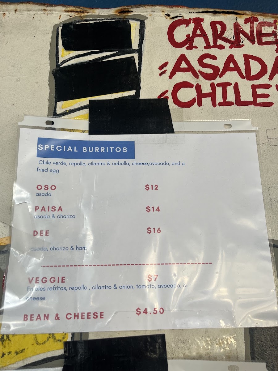 Other main dishes primarily focus on burritos and tacos, with selections like regular burritos, Oso burrito, wet Oso burrito, and burritos with chorizo and eggs. The menu also includes taco dorado, tostada ceviche, and cheese options.